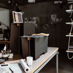 Like all RIAB cardboard furniture, the MonKey Desk is also made from the highest quality AVANA heavy-duty cardboard. In this way, we create a high level of stability and durability. In addition, our furniture convinces with its low weight and ecological sustainability. The material consists of 54 to 80 % recycled paper fibres and is 100% recyclable. Vegan glue made from corn starch joins the individual paper sheets, which are finished with solvent-free water-based inks. The result is an environmentally friendly product that can be disposed of quickly and easily at the end of its life cycle via the waste paper bin and returned to the recyclable materials cycle.