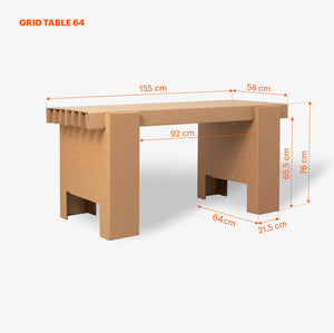 The use of high-quality corrugated cardboard makes the GRID Table not only stable but also environmentally friendly and recyclable. Corrugated cardboard is an extremely sustainable material with a recycling content ranging from 54 to 80%, fully recyclable through the paper recycling bin. The individual paper layers are bonded with natural adhesives made from corn starch and finished with solvent-free colors for the black variant. Thanks to the thoughtful slat construction, the GRID Table can withstand high loads while remaining lightweight and easy to move. It complies with the standards DIN EN 12521:2015 and DIN EN 1730:2012.