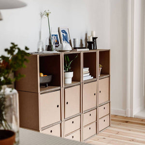The drawers as well as the corresponding shelf board are made of high-quality corrugated board with a recycled content of 54 to 80 %. The shelf inserts are both light and stable and produced in a particularly environmentally friendly way. The glue used to join the individual paper layers is made of vegan corn starch and the white, black and sage versions are finished with solvent-free, water-based inks. The result is an ecologically sustainable product that can be easily recycled via the waste paper bin and thus flows back into the material cycle.