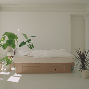 Like all our cardboard furniture, the Storage Family Bed is made of high-quality heavy-duty corrugated cardboard, which - in combination with the sophisticated construction - makes it particularly durable and stable. So stable, in fact, that it can withstand up to four people with a body weight up to 100 kg each and complies with DIN EN 1725:2024-02 and DIN EN 1022:2024-04 standards. At the same time, it is more environmentally sustainable than conventional beds due to the high recycled content (54 to 84%) in the corrugated cardboard, which in turn can be fully recycled. At the end of its life cycle, it can be easily disposed of via the waste paper garbage can and returned to the material cycle.
