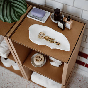 To make sure you enjoy your shelf for a long time, it is made of the highest quality heavy-duty cardboard. This consists of 54 % to 80 % recycled paper fibres and is itself 100% recyclable. This makes your cardboard shelf not only stable and light, but also ecologically sustainable. In order not to harm the environment, we use vegan glue made from corn starch and solvent-free water-based paints.