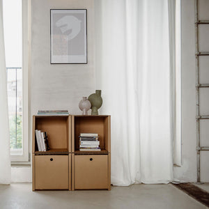 The shelf modules are currently only available in natural cardboard colour. The inserts are available in the colours natural, white, black and sage.